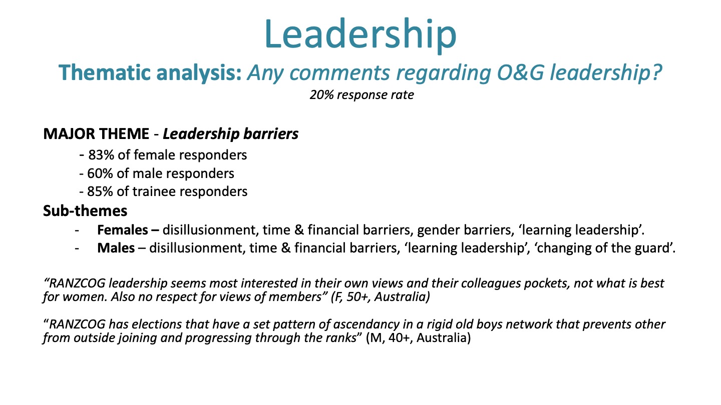 This presentation is a 24 slide summary exploring Dr Connan’s Master’s research “Gender & Leadership in Obstetrics & Gynaecology”, her findings and conclusions.